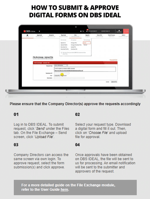 We remain committed to serving your banking needs as the COVID-19 situation continues to evolve. To ensure your safety and comfort, you can now submit and approve the following forms digitally using the File Exchange module on DBS IDEAL.