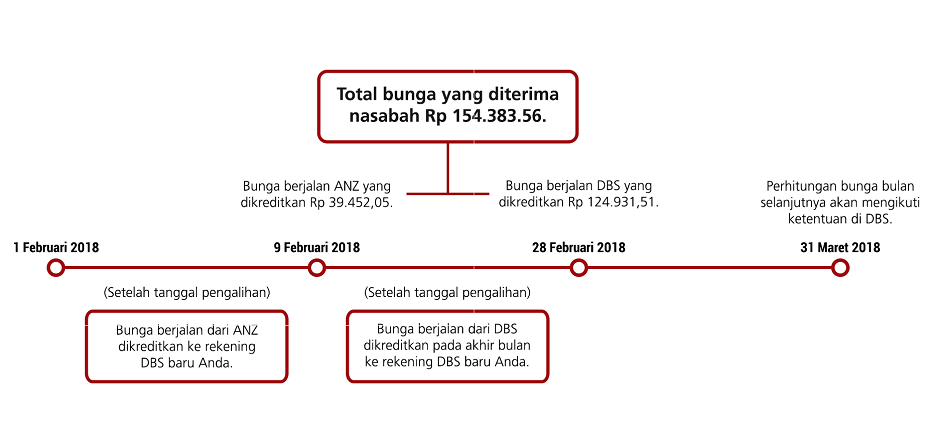 Bunga deposito dari tanggal 20 Desember 2017 sampai dengan 9 Februari 2018 sebesar Rp3.353.425,- akan dikreditkan ke rekening operatif baru nasabah di DBS pada tanggal pengalihan.