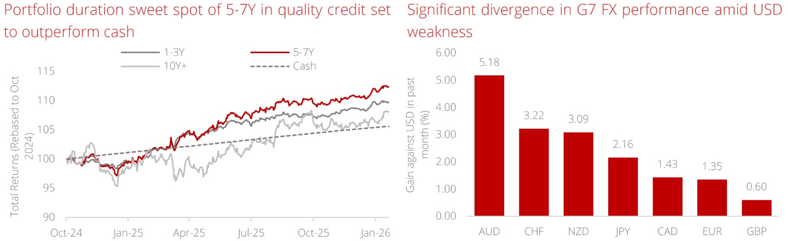 • Stretched valuations in risk assets warrant a safety tilt in portfolio construction; Favour dividend equities and gold for their defensive capabilities amid heightened volatility.