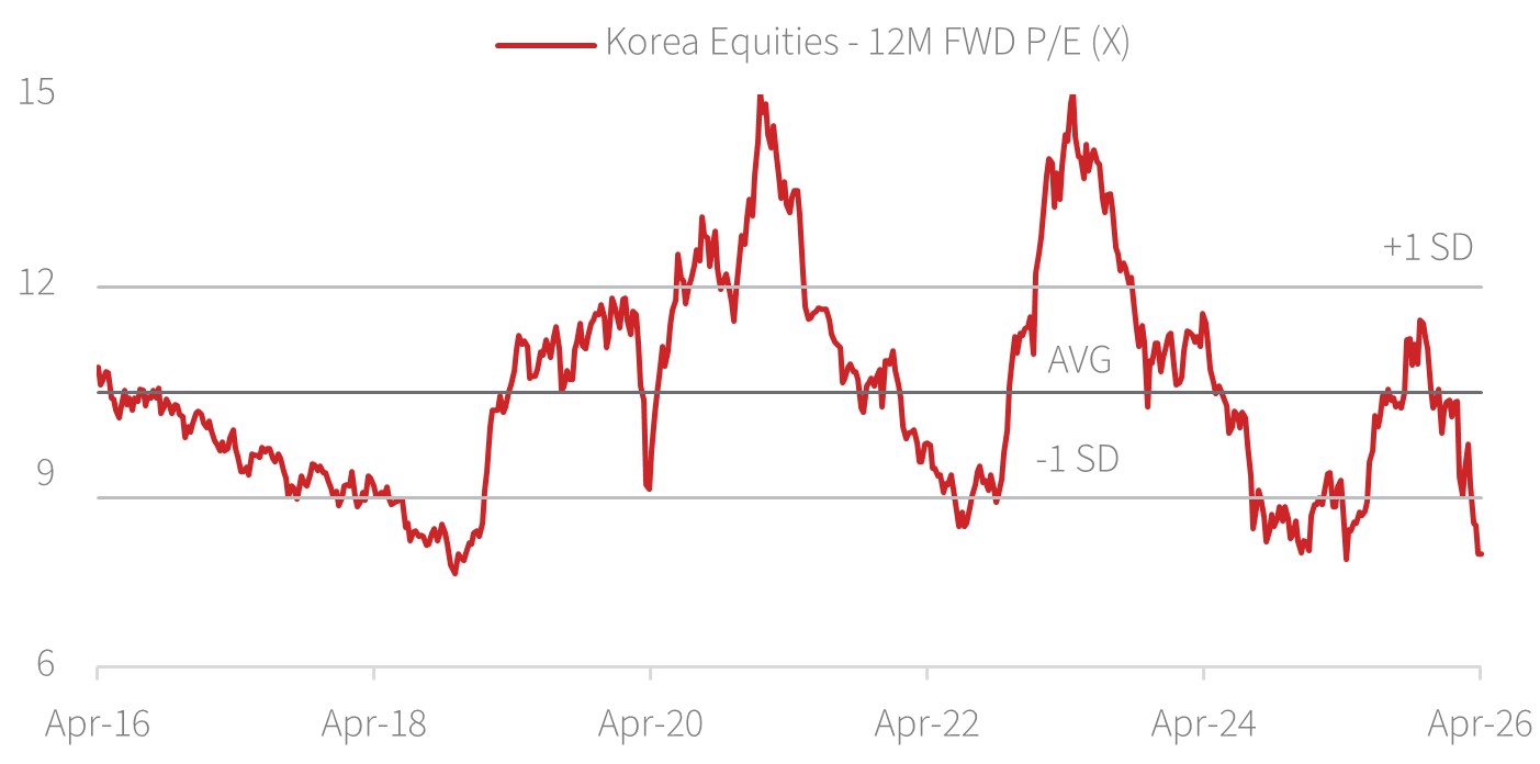 Earnings fundamentals remain strong with attractive valuations. Despite the tension, Korea’s superior earnings growth story remains strong and is now offering more compelling valuations. The market consensus expects Korea equities to achieve more than 100% earnings growth in 2026, propelled by semiconductor earnings upgrade on a prolonged supply deficit and surging AI demand. Its earnings momentum is also broadening to other sectors such as industrials, particularly defence and shipbuilding, benefitting from structural global demand and strong competitiveness.