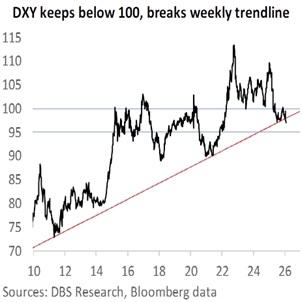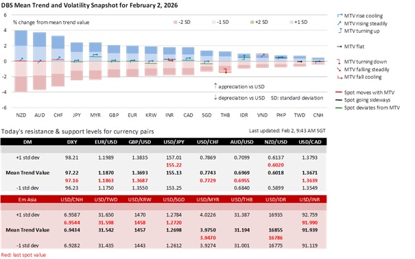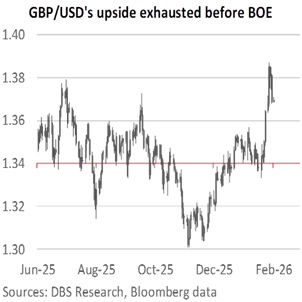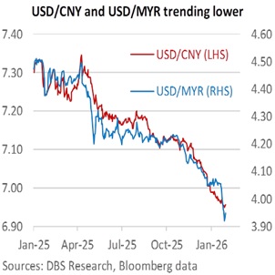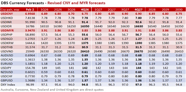 We have revised down our 3Q26 USD/CNY forecast to 6.70. The daily fixing for USD/CNY has been declining below 7.00 since January 23, when the USD sold off on US President Trump’s lack of concern over its decline, mounting unease over the threats to Fed independence, and his abrupt TACO on EU tariff threats over Greenland. Since December, when China first reported its USD1 trillion trade surplus, the onshore spot rate has consistently traded below the daily fixing, a notable break from its earlier pattern of fluctuating in the upper half of the trading band after July 2023. On February 1, Chinese President Xi Jinping also called for the CNY to become a “powerful” global currency that could be “widely used in international trade, investment and foreign exchange markets, and attain reserve currency status.”