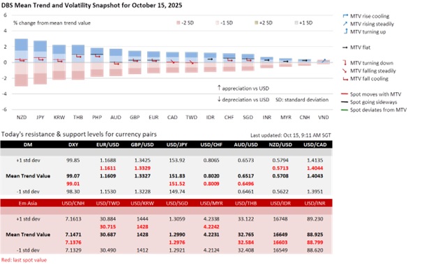 Second, our call for the US Federal Reserve to shift from data-dependency to risk management mode is materialising. Speaking at the NABE Annual Meeting overnight, Fed Chair Jerome Powell said he would look past the recent rise in inflation and keep reducing interest rates. Powell noted that the downside risks to the labour market have increased, not helped by the data lapses from the US government shutdown. Against this background, Powell observed that liquidity conditions were gradually tightening, which may warrant the Fed to stop shrinking the balance sheet in the months ahead. Powell’s comments have relegated the significance of the US CPI data release on October 24. The futures market has fully priced 25-bps cuts at this year’s two final FOMC meetings and reinstated three additional cuts in 2026.
