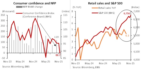 UST yields continue to fall, with the 10Y touching 3.99% intraday. The probability of a December Fed cut swings back to 82% from below 30% last week. The less-hawkish commentary from Fed officials and softening data prints are the key catalysts. The September retail sales growth prints weaker-than-expected at 0.2% MoM (vs. est. 0.4%). The Conference Board Consumer Confidence Index plunges to a 7 month-low of 88.7 in November. Big-ticket items sales such as motor vehicles and parts fall -0.3% MoM, while electronics and sporting goods also contract. Labour market softness (see: UST rally despite strong NFP) continues to cloud spending sentiment. With employee compensation accounting for 60% of personal income, any labour market weakness should continue to drag retail sales performance. Meanwhile, further gains in asset markets are unlikely to translate into stronger wealth effects for the broader consumer base. Correspondingly, we note a K-shaped divergence between retail sales and the S&P 500.