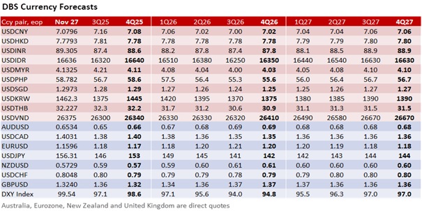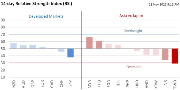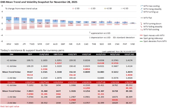 With thinner trades due to the US Thanksgiving holiday, FX volatility has eased with the DXY consolidating around mid-99 levels. The Fed Beige Book released overnight was mixed. Overall consumer spending declined further, though higher-end retail spending remained resilient. While labor demand is weaker for half of the reporting Districts, prices rose moderately with widespread input cost pressures due to tariff-induced increases. The mixed picture supports the Fed’s cautious approach to cutting rates, and a resultant tepid decline of the USD.