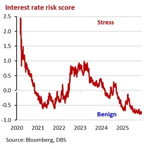 Today we focus on Interest Rates. The interest rate risk score remained at a multi-year low. The drop from the spike in early April stemmed from lower US interest rate volatility amid de-escalated US tariff tensions and resumption of US Fed monetary easing since September, as well as further narrowing of Europe sovereign spreads amid Southern Europe’s improved fiscal health and interest rate cuts by the European Central Bank this year. US inflation expectations, based on swaps, have remained stable over the past few months, despite US tariffs. The risk score could be biased much higher should severe stress conditions emerge from a sharp reignition of US inflation, and/or unexpected financial instability events.
