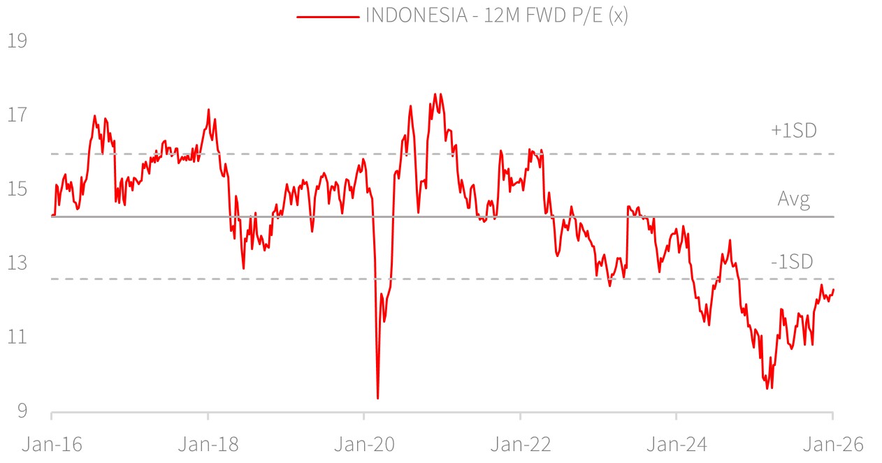 We believe the sell-off as a result of the confusion has been stamped out. The index provider’s plan, announced last year, to review the free float classification, may have also hindered major inflows. This has led to relatively low foreign ownership after persistent foreign investor outflows in 2025. Indonesia’s largest bank has announced IDR5tn in share buyback plans, and other large conglomerates have existing share buyback plans, which may be triggered. The Financial Services Authority (OJK) has also responded promptly, announcing a minimum free float requirement of 15% for public companies.