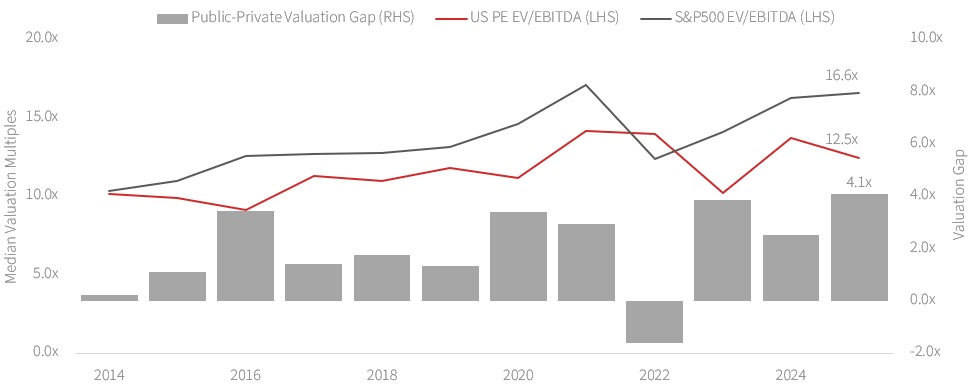 Relative value shifts back toward private markets. Private equity is undergoing a meaningful transition, and for long-term investors, this shift may be creating more attractive opportunities than we have seen in several years. To understand why, we must begin with valuations. Over the past few years, higher interest rates have slowed deal activity and moderated valuations. Meanwhile, segments of the public equity market, particularly large-capitalisation technology stocks, have appreciated sharply. The result is that private assets no longer look as relatively expensive as they once did. For investors, this creates a golden window of opportunity to capitalise on low entry multiples. Moreover, with rate cuts now set in motion, valuation multiples could see steady uplifts over time, creating a compelling case for private equity.