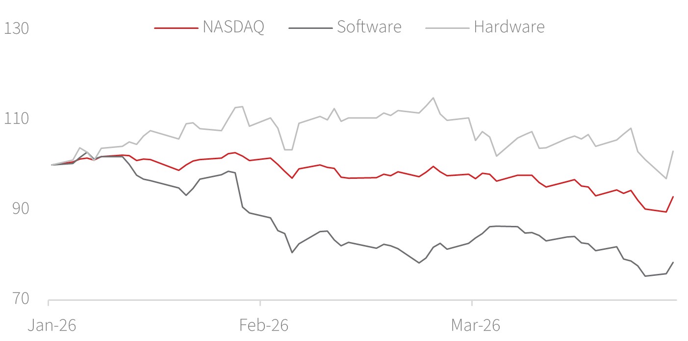 Figure 1: Risk-off pressures weigh on technology with software lagging