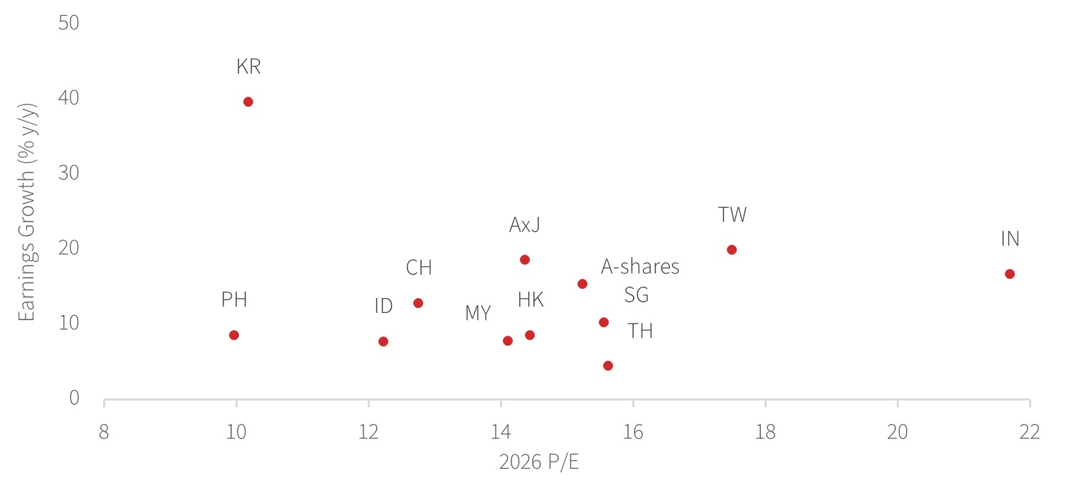 Korea's GDP growth is projected to return to its normal trajectory of approximately 2% in 2026, up from an estimated low of 1% in 2025, driven by stronger domestic demand and a recovery in exports. Private consumption has begun its recovery in 2H25, supported by more accommodative fiscal and monetary policies and easing political uncertainties. Despite YTD performance, the market remains attractive at a 2026 P/E ratio of 9.8x, the lowest valuation among Asia ex-Japan (AxJ) markets.