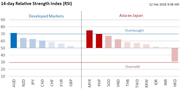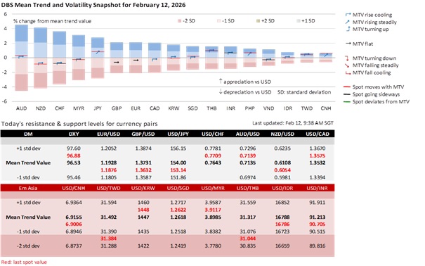 Singapore will be announcing Budget 2026 today. The Ministry of Trade and Industry has, on February 10, upgraded the 2026 GDP growth outlook to 2-4% from 1-3% previously. The Monetary Authority of Singapore had already raised, at its last review on January 29, its 2026 headline and core inflation outlook to 1-2% from 0.5-1.5% previously. Given the rise in labour productivity amid lower unit labour costs, stable to negative import price changes, and negative domestic supply price changes, we see scope for the SGD policy to remain unchanged in April, as it did last month. According to our model, the SGD NEER has been strong after the policy review, averaging some 0.2% below the policy band’s ceiling. USD/SGD’s decline from 1.27 to 1.2620 was driven mostly by the USD’s weakness against its trade-weighted basket of currencies. While the USD’s tone remains weak, reduced market participation may dampen volatility due to next week’s US holiday and the Lunar New Year holiday across most of Asia.