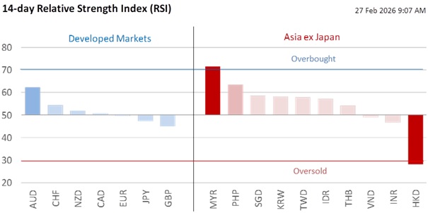 China is a winner from the cancellation of all US IEEPA-related reciprocal tariffs, helping to buoy the offshore RMB by 0.8% this week. China’s relative competitive disadvantage against others due to its higher 20% reciprocal tariff is now gone, with all countries facing the same 10% tariff starting this Tuesday. While the US has signalled new trade investigations that could result in Section 301 tariffs against unfair Chinese trade practices, it is unlikely they will be implemented in the short-term, lest they jeopardise Trump’s high-profile visit to Beijing scheduled 31st March. Given lesser trade headwinds, it is no surprise that that the PBOC has been comfortable allowing RMB appreciation. Since the Lunar New Year, the USD/CNY fixing has been calibrated down to around 6.92, marking its lowest level since May 2023.