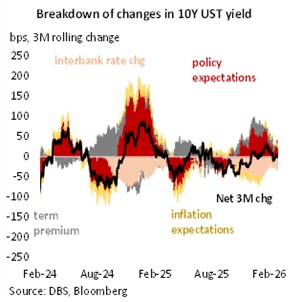 There has been a material shift in underlying sentiment as investors sought safety in US Treasuries. To be sure, we are not at full-blown risk off but we note that key levels (2Y at 3.4% and 10Y at 4%) have been broken. However, there are a few narratives that are worth monitoring. First, the transition from sector rotation to sector disruption (arising from AI) keeping putting a dampener on software companies. Moreover, we note that some of the large tech players are lagging the broader equity market. While these shifts may be violent on a sectoral / individual name level, the translation into the VIX has been muted. However, that does not mean that all is calm. VIX may be understating equity undercurrent. We would be monitoring proxies for private assets and financial institutions. Second, Iranian tensions have boiled over. Markets have been anticipating this risk for a while, with Brent crude pushing above USD 70/bbl. The length (how long the conflict lasts), the extent (how many countries get involved) matters. From a markets’ perspective, getting a gauge on the disruption of energy supplies via the Straits of Hormuz is the most important.