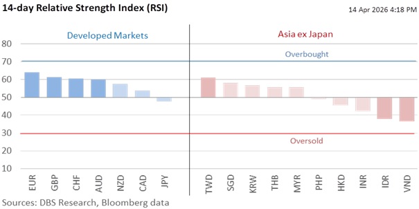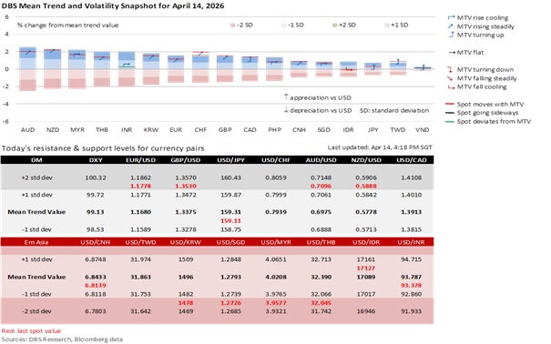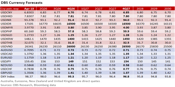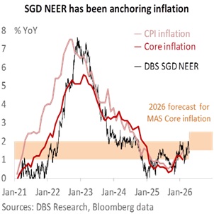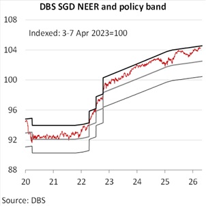 Today’s decision is consistent with our call for the central bank to normalize the policy band by taking back the slope reductions in January and April 2025. Given the considerable concomitant risks posed to inflation from elevated oil prices, and the economy from energy supply disruption, the MAS would want to maintain policy flexibility, backed by its readiness to curb excessive volatility in the SGD NEER, alongside its decision not to adjust the centre or the width of the band. According to our model, the SGD NEER has averaged 1.7% above the band’s mid-point after Operation Epic Fury. The latest slope adjustment should allow the SGD NEER to increase faster year-on-year with the new inflation forecasts. As for USD/SGD, it remains tied to the DXY Index as a price taker.