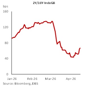 Further downside to the front end should be limited with rate cuts off the table. BI is likely to "wait and see" until a more definitive development in the Middle East conflict re-tilts the balance of risks. Longer yields should continue to face headwinds from fiscal concerns, mirroring the persistent weakness in the rupiah, which tested the 17,200 level against the dollar last week.