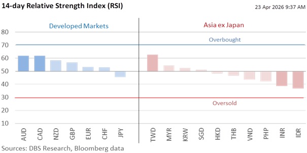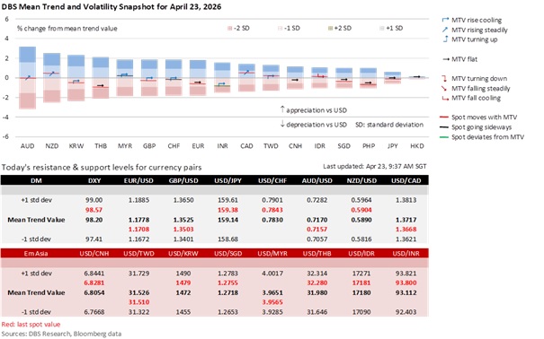 As the currency markets approach the April 28 deadline, volatility has shifted into a tense wait-and-see consolidation, as reflected by the recent flattening of USD/CNY. Markets are increasingly hesitant to commit to directional bets after the relief rally that rode the Trump off-ramp hope in the first half of this month. The geopolitical tensions complicate the landscape for global central banks, most of which are scheduled to meet next week. The consensus expects central banks to maintain steady rates as policymakers grapple with the shadow of stagflation cast by the US-Iranian stand-off. Asia’s most oil-dependent currencies – the INR, KRW, and PHP – should continue to fluctuate with oil prices, with authorities standing by to discourage one-way bets on depreciation.