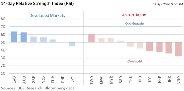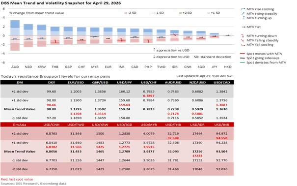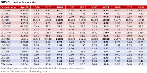 The USD was subdued despite higher oil prices. Brent crude rose 2.8% to $111.26 per barrel overnight, driven by the UAE’s shock announcement to exit OPEC and the broader OPEC+ alliance on May 1. Although this was Brent’s first daily close above $110 since March 31, the DXY Index held a tight range of 98.2-98.9 in the past week. Looking past the geopolitical schism within the Gulf Cooperation Council, the UAE’s intention to increase production to 5 million barrels per day from its current quota of 3.4 million bpd could send oil prices tumbling if the US and Iran surprises with an off-ramp to end the twin blockade in the Strait of Hormuz on May 1, which is the 60-day deadline of Operation Epic Fury under the War Powers Resolution of 1973. If so, the focus could shift towards the next chapter of the Fed under President Donald Trump’s nominee, Kevin Warsh.